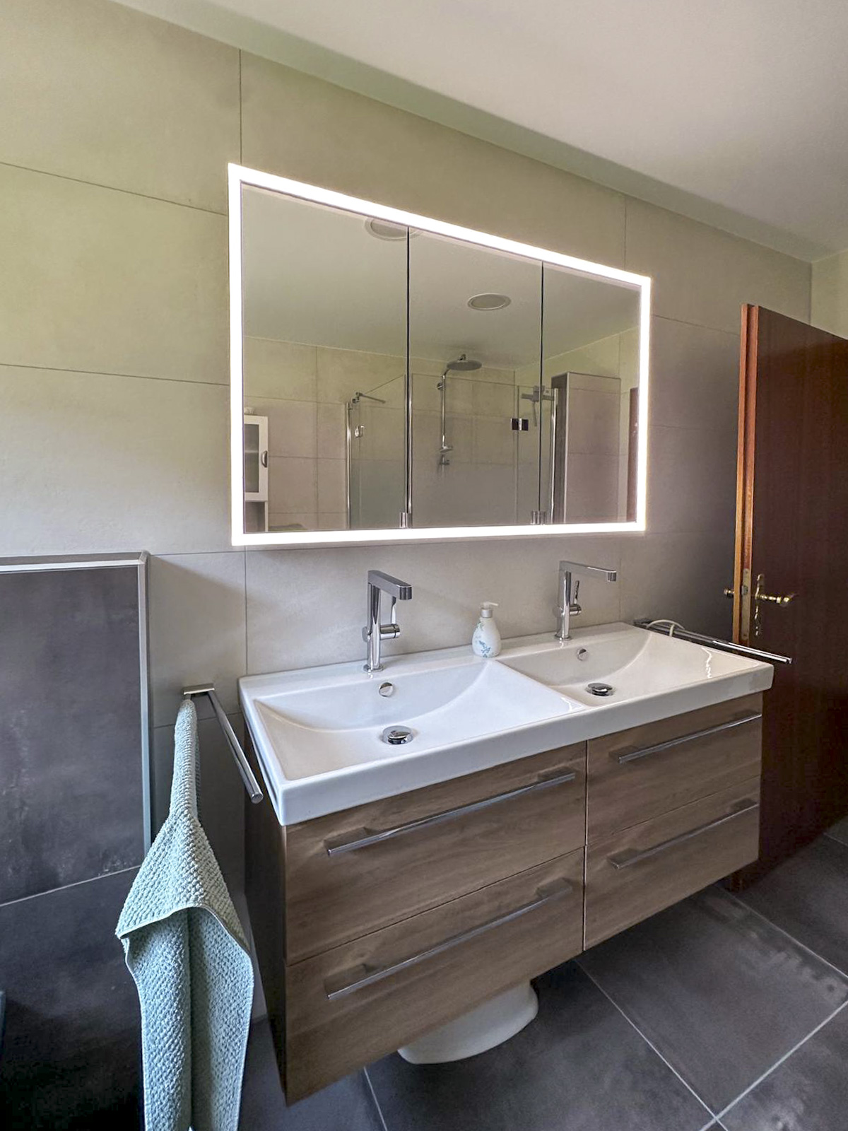 Neuer Waschtisch & Badmöbel: Ein großzügiger Doppelwaschtisch mit eleganten Laguna-Badmöbeln bietet viel Stauraum und verbindet Funktionalität mit stilvollem Design. Der beleuchtete Spiegelschrank sorgt für optimale Lichtverhältnisse und eine moderne Atmosphäre.