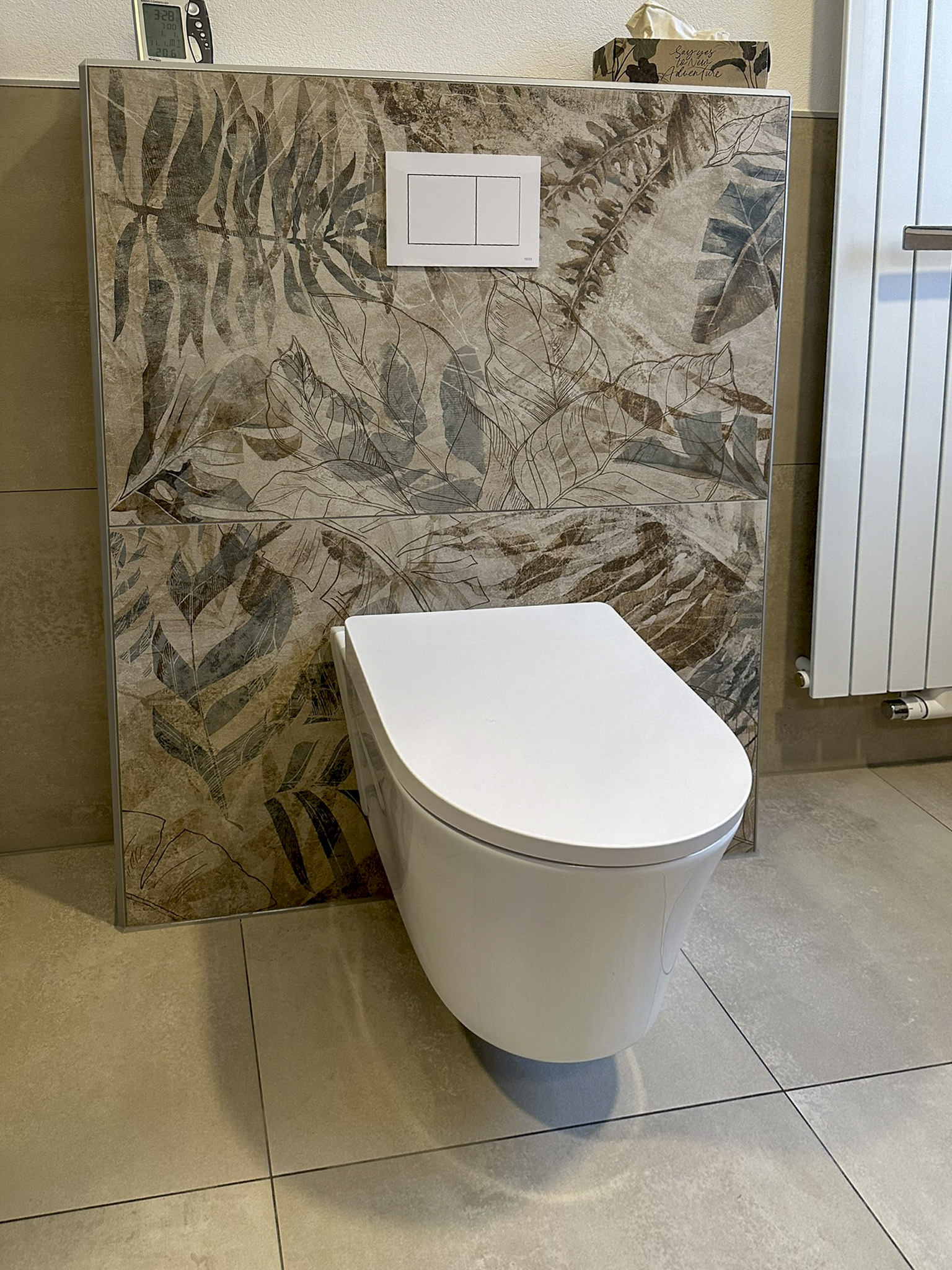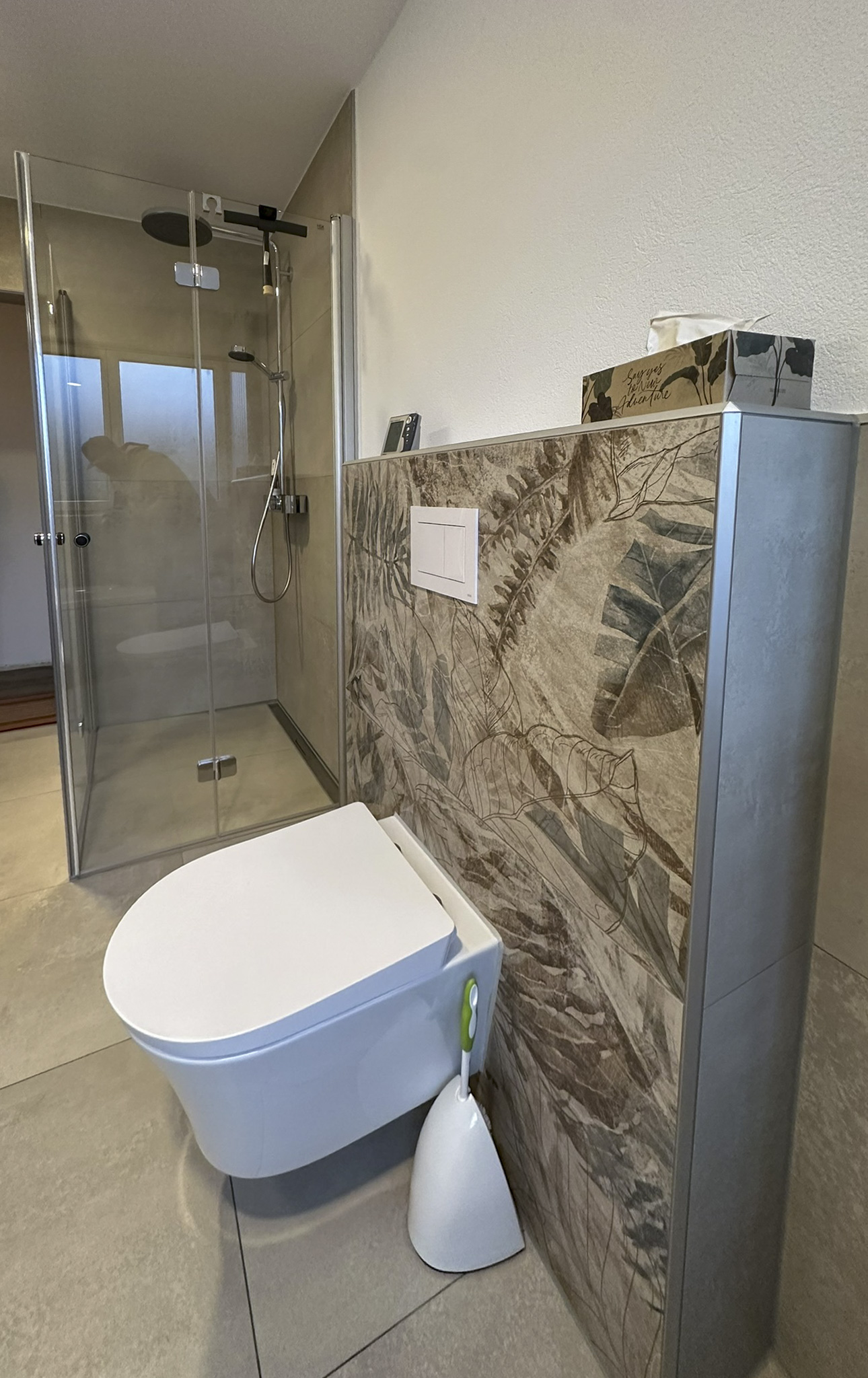 Besonders hervorzuheben ist die fugenlose Gestaltung, die nicht nur für eine elegante Optik sorgt, sondern auch die Reinigung erheblich erleichtert. Eine großzügige bodengleiche Dusche mit Glasabtrennung von HSK und Armaturen von Hansgrohe bringt modernen Komfort ins Bad. Ergänzt wird das neue Raumkonzept durch ein Dusch-WC von Toto, das höchsten Hygienestandard bietet.